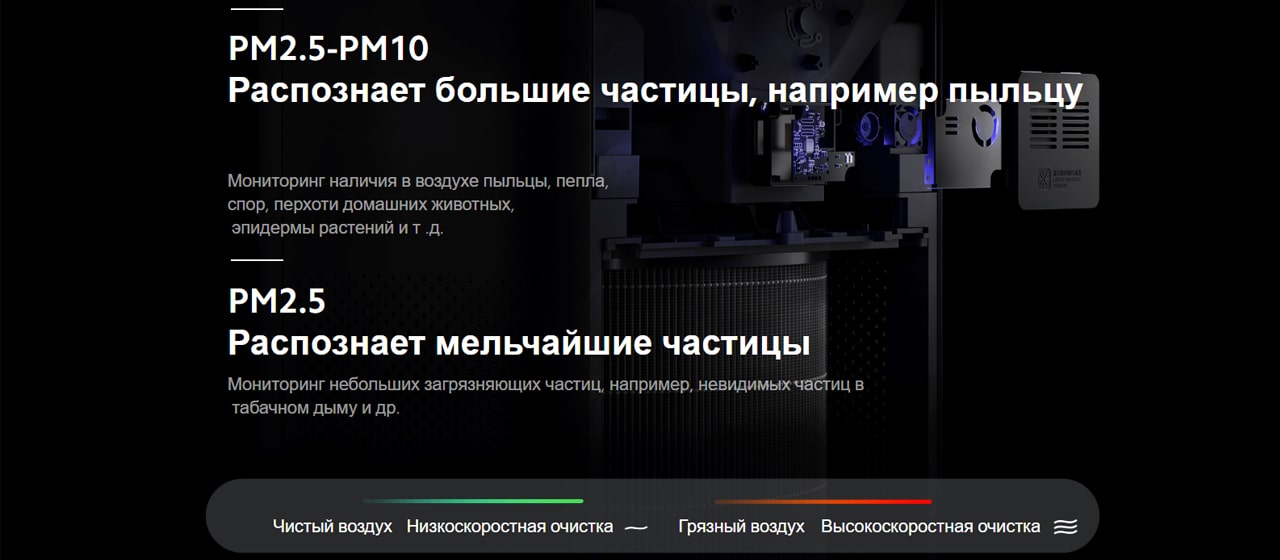 OLED-дисплей в режиме реального времени отображает количество частиц PM2.5 в воздухе и режим работы + наглядная иллюстрация качества воздуха при помощи цветного индикатора.